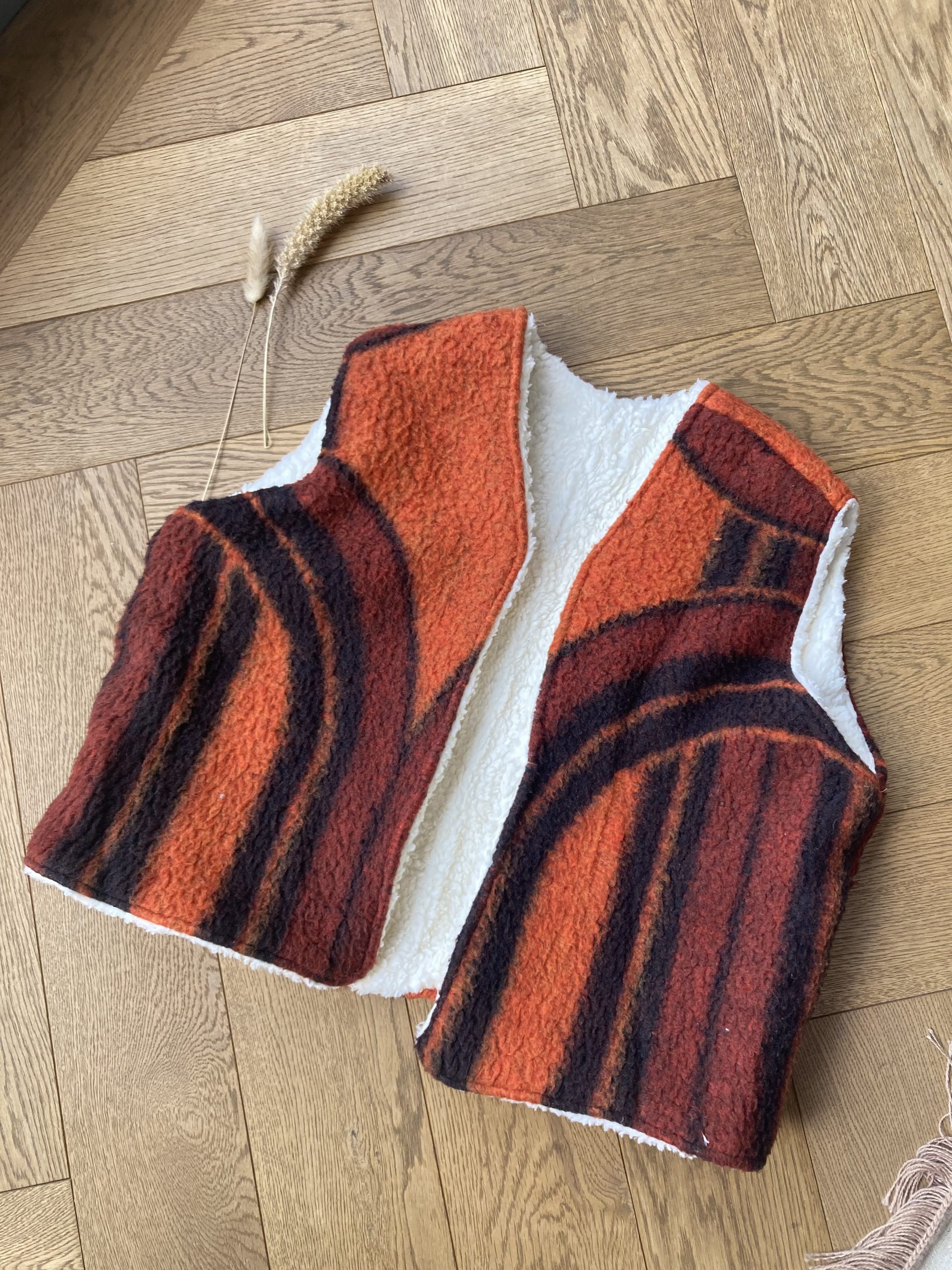 Buitenzijde van wol; gemaakt van een oude wollen deken. Binnenzijde 100% (teddy) katoen. Ideaal voor frisse festivaldagen!