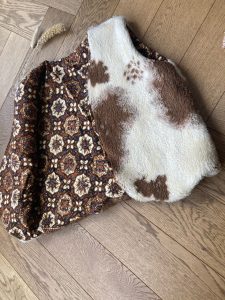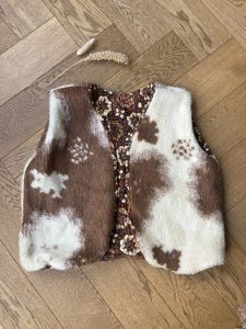 Superzacht en omkeerbare bodywarmer. Ideaal voor koele zomeravonden of nog wat frisse festivaldagen in de lente! Handgemaakt, Binnenkant: Indonesisch Batikstof, buitenkant: acrylmix ‘koe’ motief.